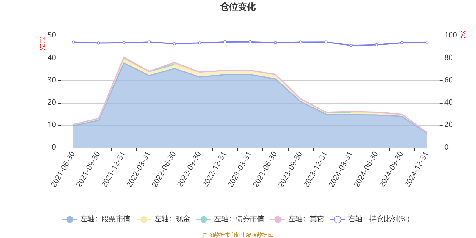 据定期报告数据统计,基金股票仓位长期保持较高水平,近三年平均股票仓位为93.62%,同类平均为87.17%。2023年一季度末基金达到94.5%的最高仓位,2024年一季度末最低,为91.36%。
